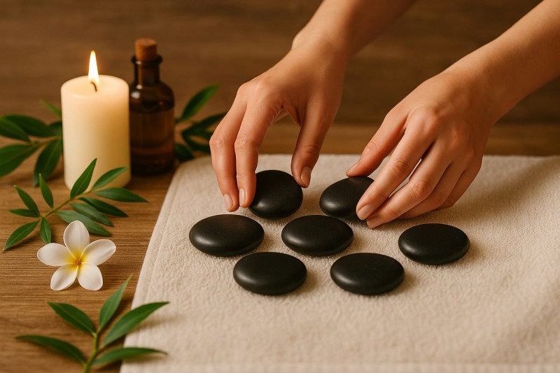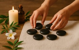 | MASSAGEM COM PEDRAS QUENTES  A massagem com pedras quentes é a mistura de duas técnicas distintas, a da massoterapia e termoterapia por meio do calor. São utilizadas pedras quentes, óleos essenciais e também movimentos manuais, para massajar todo o corpo. As pedras utilizadas nesta massagem, de origem vulcânica, são aquecidas à temperatura ideal para libertar calor e propriedades terapêuticas, que ao massajar cada um dos músculos e zonas do corpo, vão proporcionar o mais profundo relaxamento.